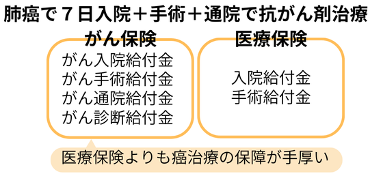 例えば、肺癌で入院・手術をし退院後に通院で抗がん剤治療が施行された場合、がん保険では、がん診断給付金・入院・手術給付金・通院給付金・がん治療給付金などを受け取ることができます。医療保険の主契約では、入院・手術給付金のみの保障となります。