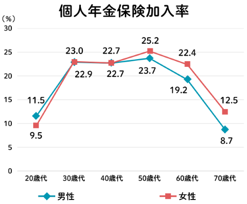 それでは、個人年金保険に加入している人はどの年代が多いのでしょうか。生命保険文化センターの「生活保障に関する調査」によると、20代の加入率は男性11.5%、女性9.5%と低いですが、30代から加入率が20%を超えています。ある程度のライフスタイルが確立し、収入が安定してくる30代や40代から個人年金を始めている人が多いようです。
